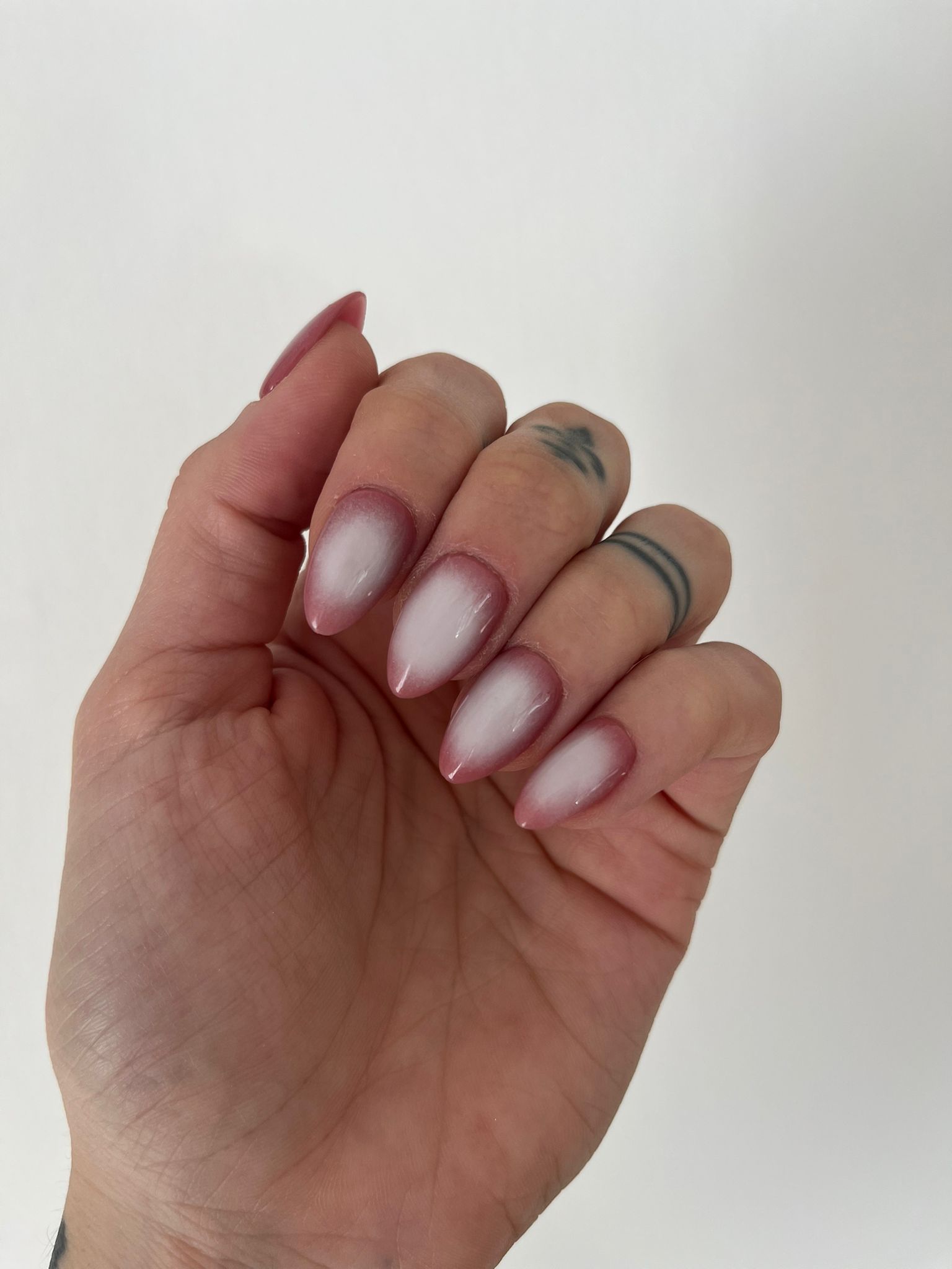 Base rosa-nude con aura blanca en el centro. Las imágenes de referencia son del largo y forma “almendra corta”. Pueden encargarse en cualqueira de los largos y formas disponibles. Incluye kit de aplicación.