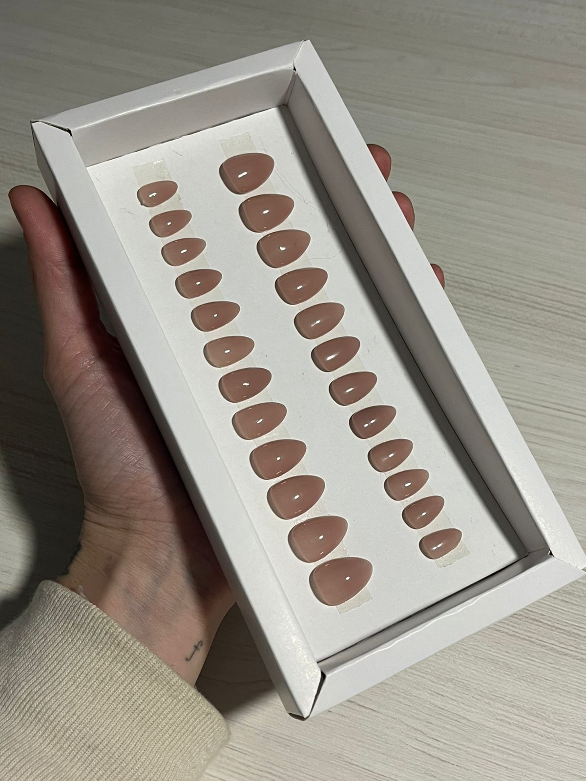 Tono nude-rosado translúcido. Las imágenes de referencia son del largo y forma “almendra corta”. Pueden encargarse en cualqueira de los largos y formas disponibles. Incluye kit de aplicación.