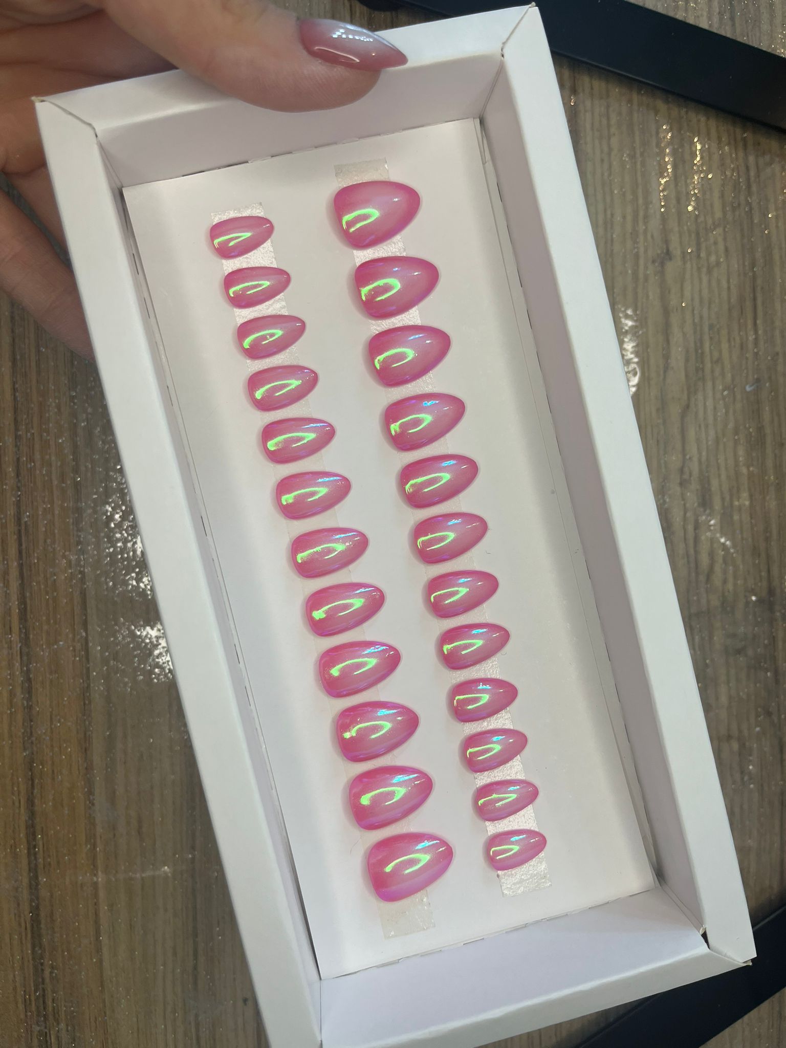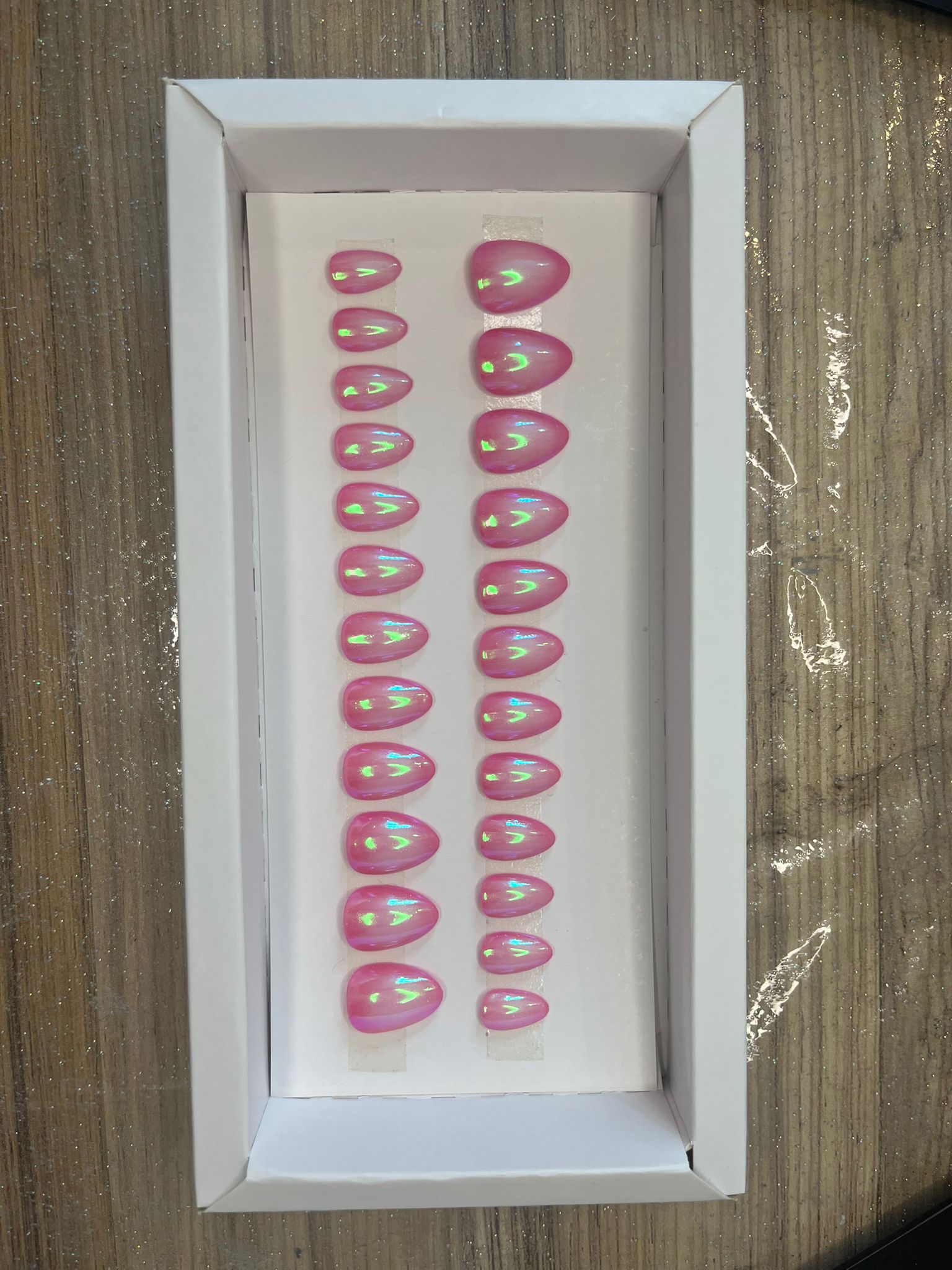 Fucsia neón con aura blanca cromada. Las imágenes de referencia son del largo y forma “almendra corta”. Pueden encargarse en cualqueira de los largos y formas disponibles. Incluye kit de aplicación.
