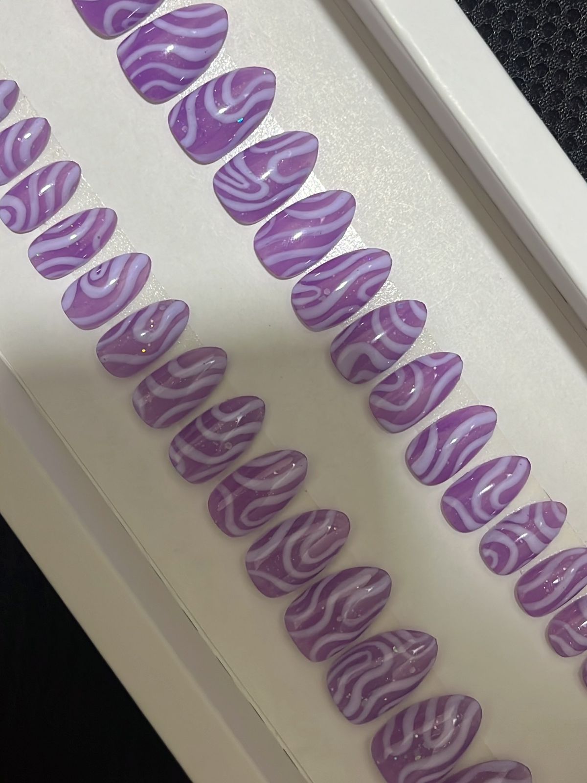 Violeta con glitter y diseño minimalista en lila. Las imágenes de referencia son del largo y forma “almendra mediana”. Pueden encargarse en cualqueira de los largos y formas disponibles. Incluye kit de aplicación.
