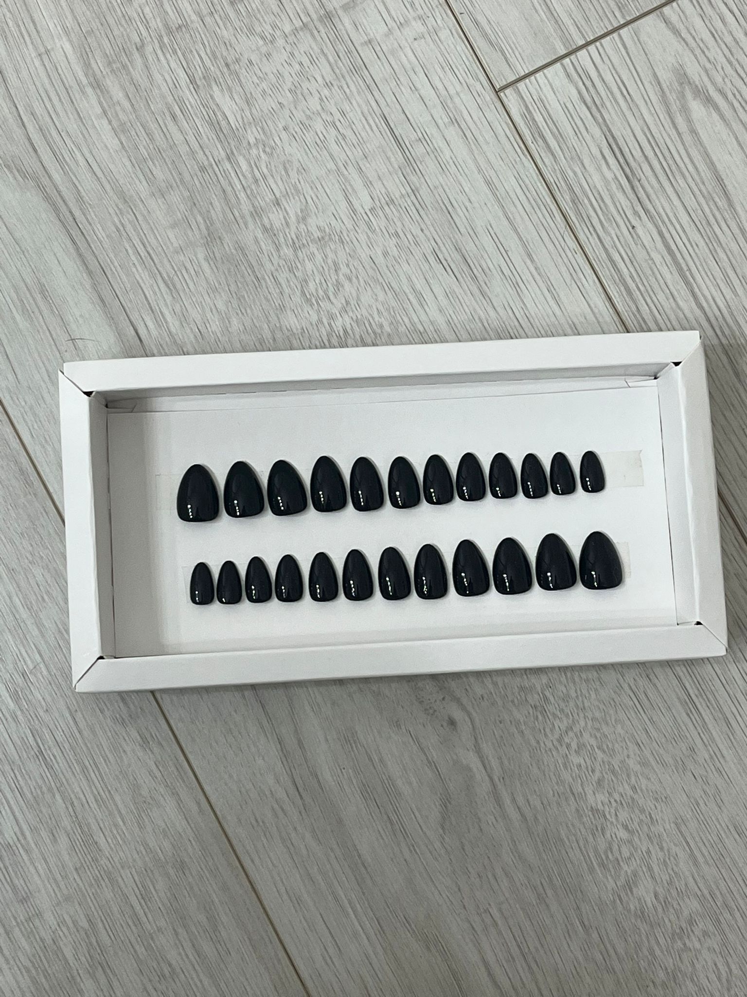 Negras clásicas. Las imágenes de referencia son del largo y forma “almendra corta”. Pueden encargarse en cualqueira de los largos y formas disponibles. Incluye kit de aplicación.